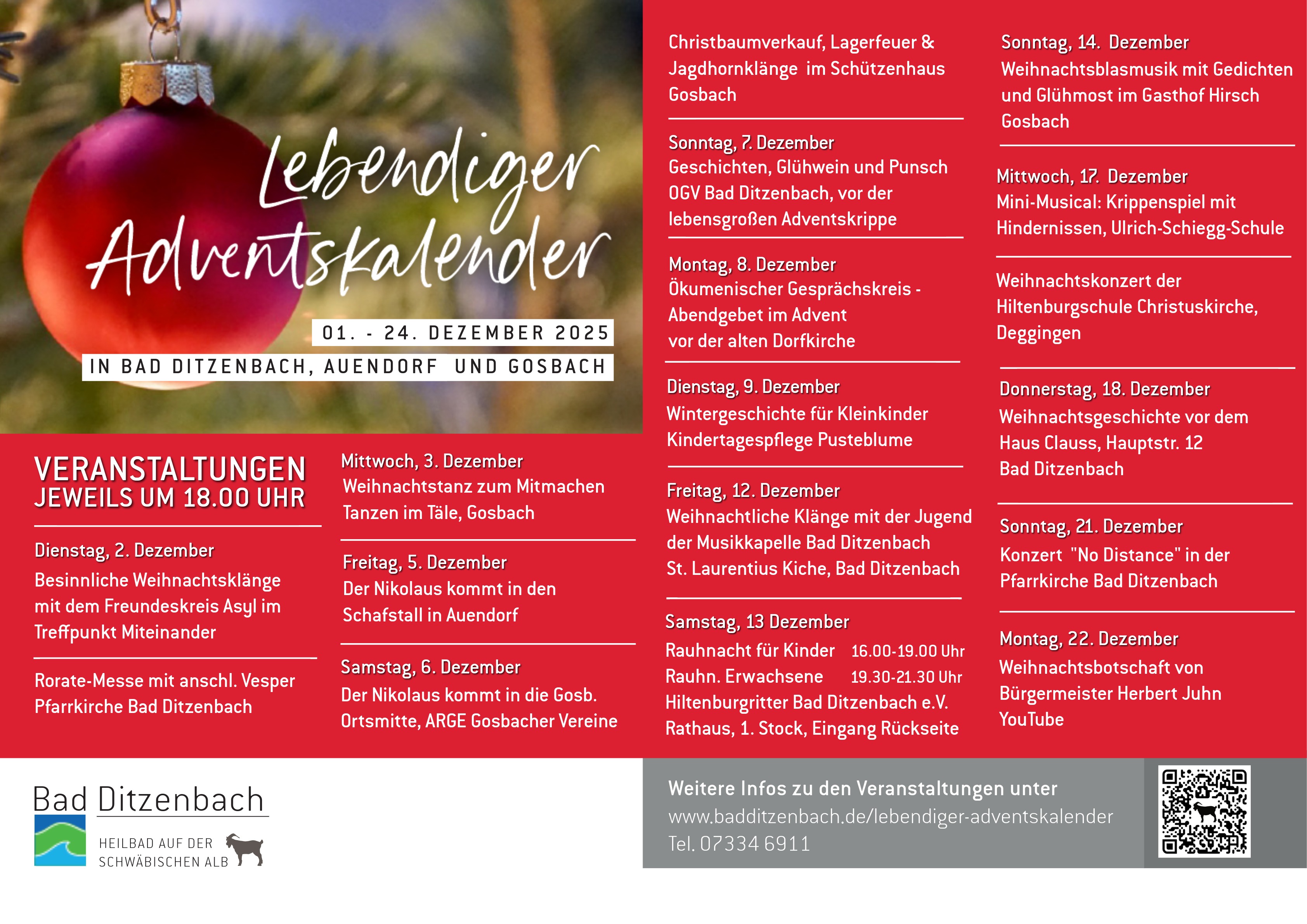 An ausgewählten Plätzen in den Teilorten Auendorf, Bad Ditzenbach und Gosbach finden lebendige Veranstaltungen zur Einstimmung in den Advent statt. Egal ob etwas in besonderer Form weihnachtlich dekoriert wird, eine Geschichte vorgelesen, ein Adventslied gespielt oder ein Gebet gesprochen wird. Die vorweihnachtlichen Überraschungen werden von Einzelpersonen, Familien, Hausgemeinschaften, Vereinen, Schulen, Kindergärten, Kirchengemeinden und vielen mehr organisiert.